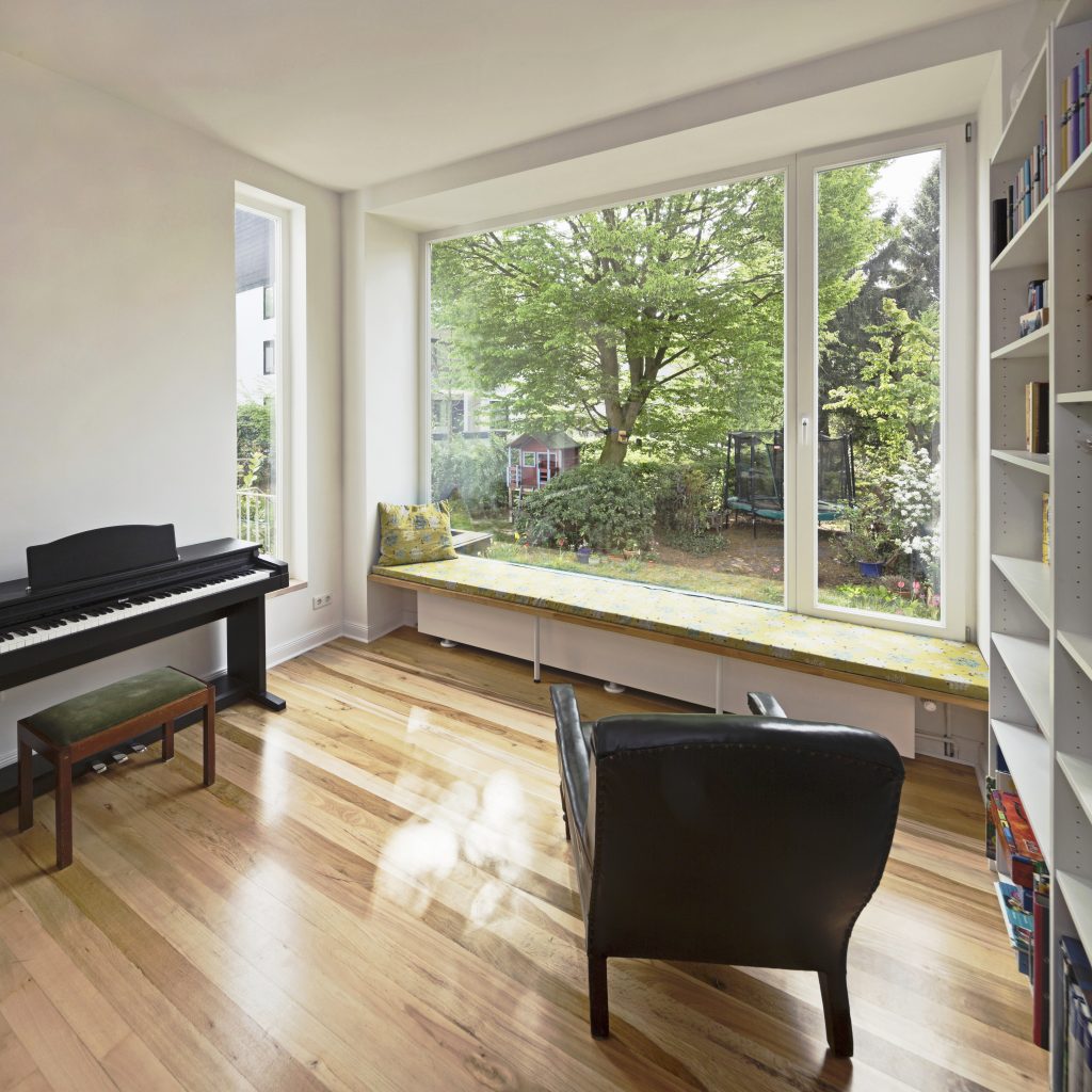 In diesem Zuge wurde im Hochparterre der Wohn- und Essbereich mit einem „Schaufenster“ zum Garten hin großzügig geöffnet. Um die Morgensonne einzufangen, wurde zudem seitlich ein schmales Fenster integriert. So ist ein grüner Ausblick nach Außen mit viel Licht im Inneren entstanden.